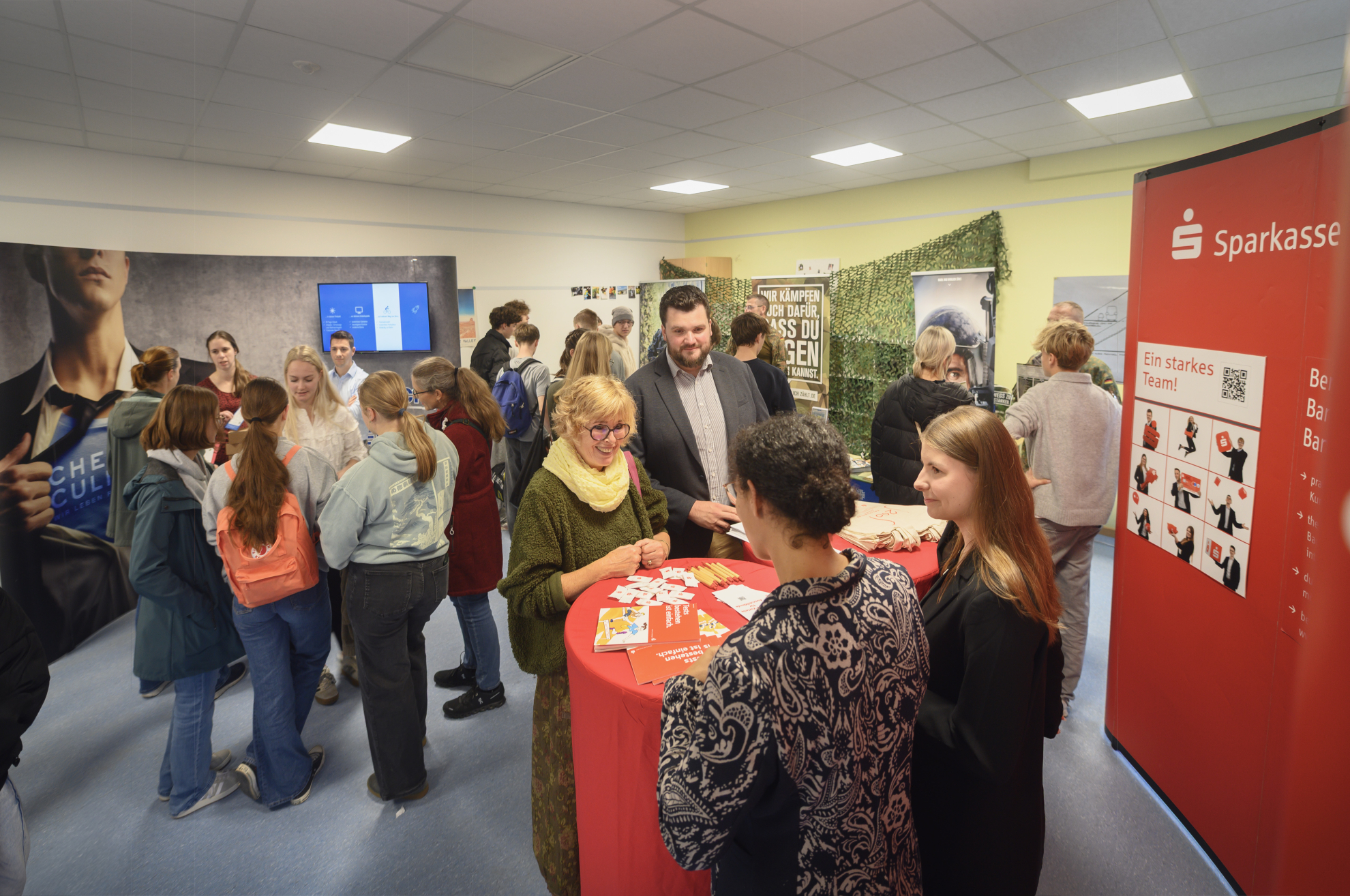 Bürgermeisterin Britta Schulz und Wirtschaftsförderer Andre Brüggemann besuchten alle Messestände und nutzten die Gelegenheit, mit Ausstellern und Jugendlichen ins Gespräch zu kommen. Beide zeigten sich beeindruckt von der Vielfalt der präsentierten Ausbildungsberufe und dem großen Interesse der Schülerinnen und Schüler.