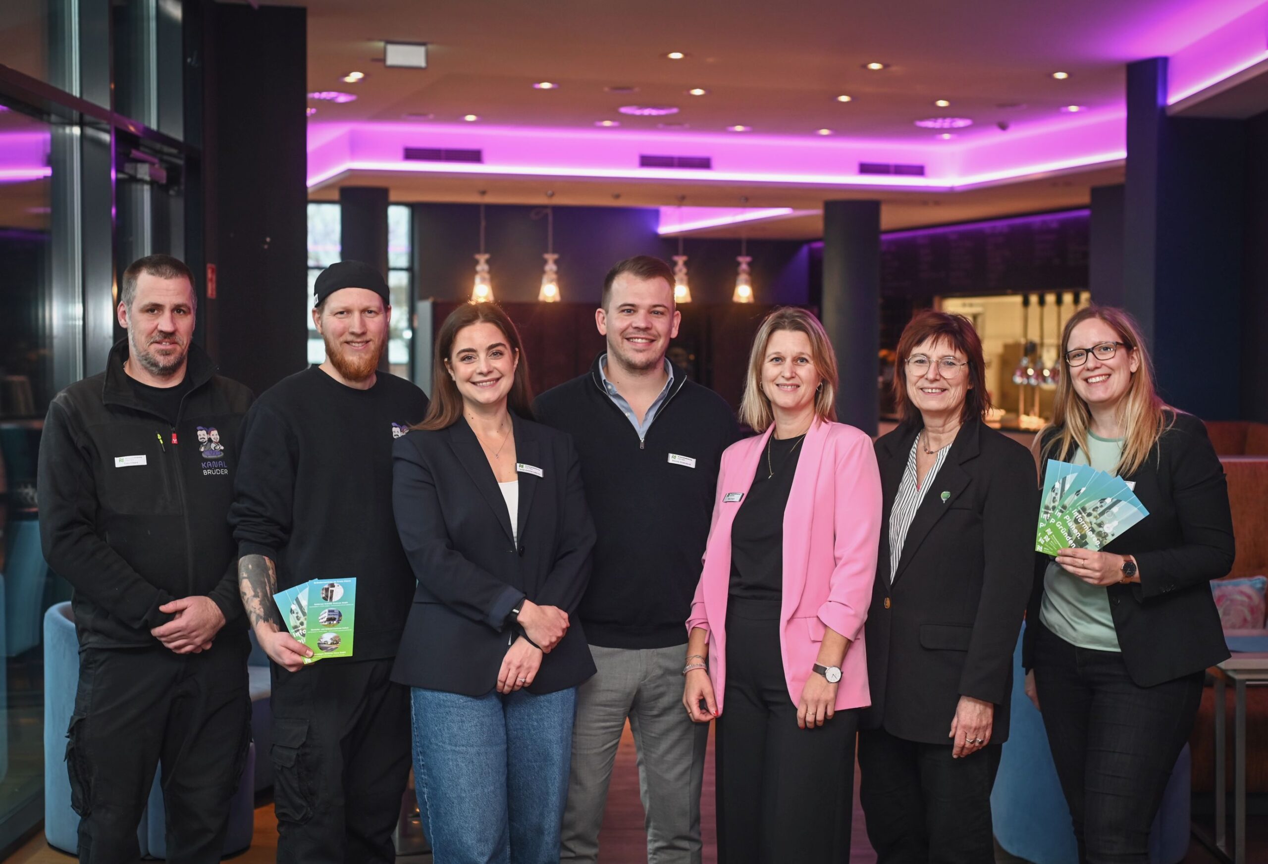 Über den erfolgreichen Austausch freuten sich (v.l.n.r.): Timo und Pascal Elbers (Gründer von Kanalbrüder GmbH & Co. KG), Tanja Ammersdörfer und Dennis Groesdonk (Gründer von GOAL GmbH), Vera Koch (Moderation) Brigitte Jansen und Irina Janßen (WfG Kreis Kleve). | Foto: WfG Kreis Kleve/ Markus van Offern
