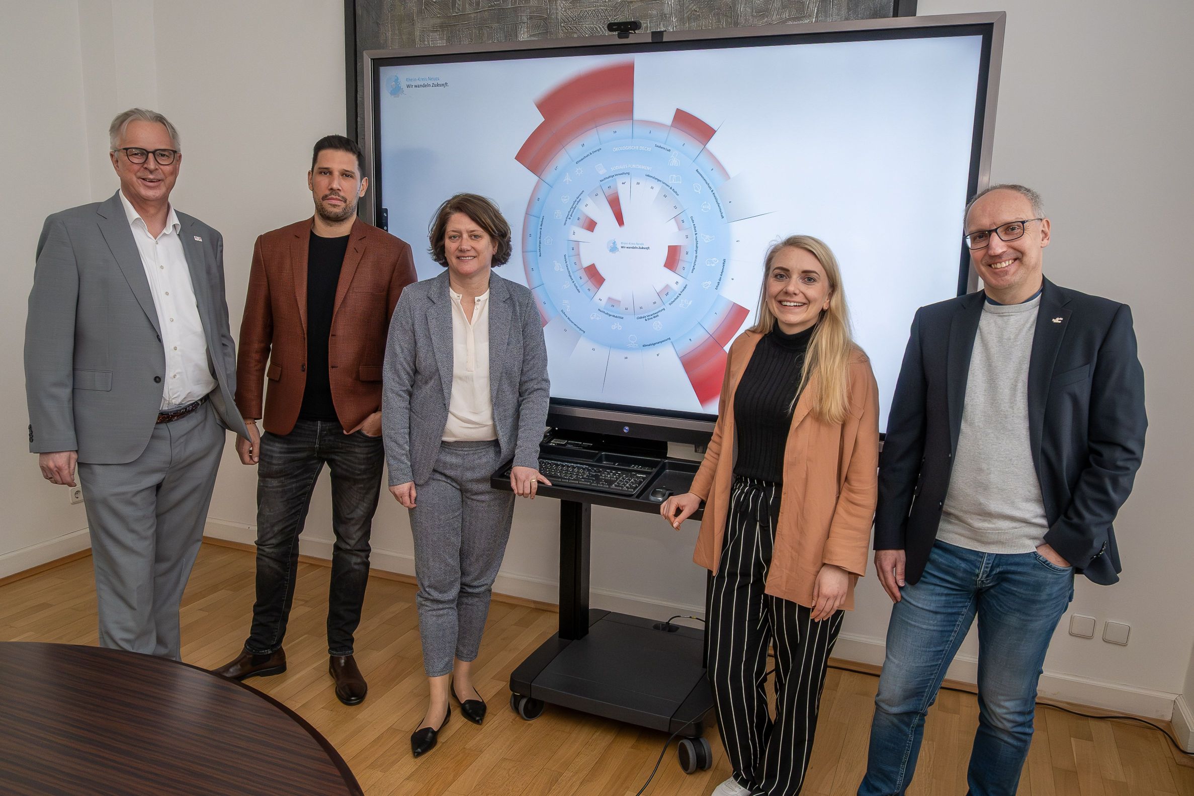 „Donut-Modell“ (von links): Kreisdirektor Dirk Brügge, Thiago de Carvalho Zakrzewski, der Beauftragte für Klimaschutz und Nachhaltigkeit des Kreises, Landrätin Katharina Reinhold, Nachhaltigkeitsmanagerin Aileen Wichmann und Amtsleiter Marcus Temburg. | Foto: S. Büntig/Rhein-Kreis Neuss