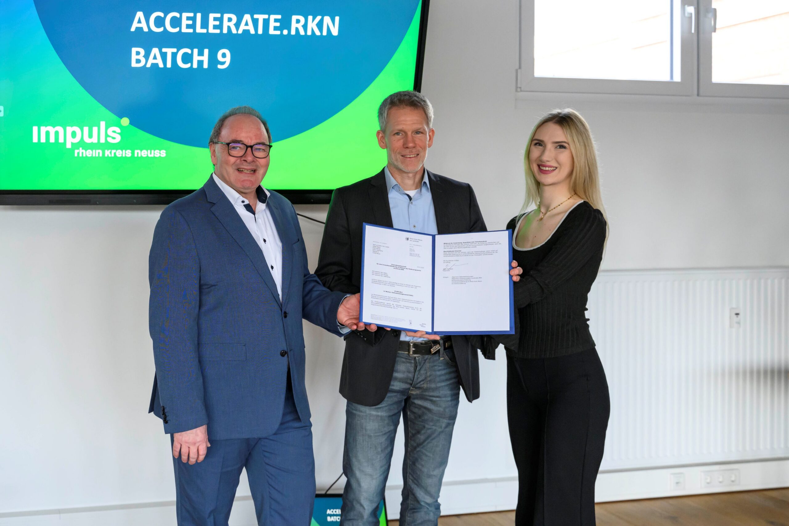 Teilnahmeurkunde des Rhein-Kreis-Neuss-Programms accelerate.RKN überreicht (von links): Robert Abts, Holger Baten und Elena Huth. | Foto: W. Walter/ Rhein-Kreis Neuss